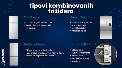 Kombinovani frižideri se dele na samostojeće i ugradne (integrisane) modele, a izbor zavisi od prostora, izgleda kuhinje i načina ugradnje. U nastavku su glavne razlike i prednosti oba tipa: