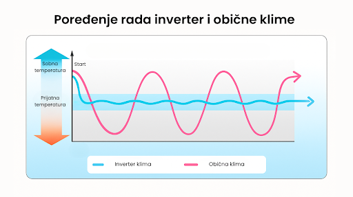 Za razliku od klasičnih on/off klima, inverter tehnologija omogućava kontinuirno prilagođavanje snage kompresora, što znači da uređaj ne mora stalno da se uključuje i isključuje da bi održao zadatu temperaturu. Rezultat je manja potrošnja struje (do 40% uštede), tiši rad i stabilniji komfor bez temperaturnih oscilacija.